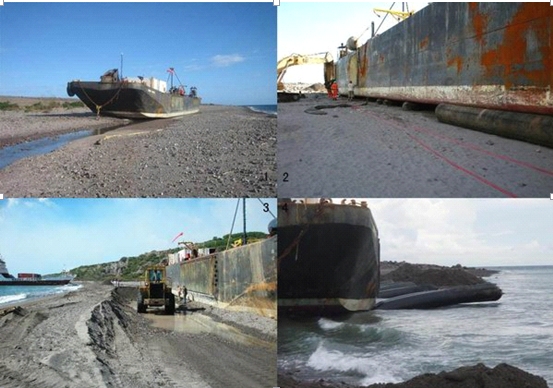 圖3:為船推出一個下水的斜坡。圖4:使用拖船與氣囊使船重**中
